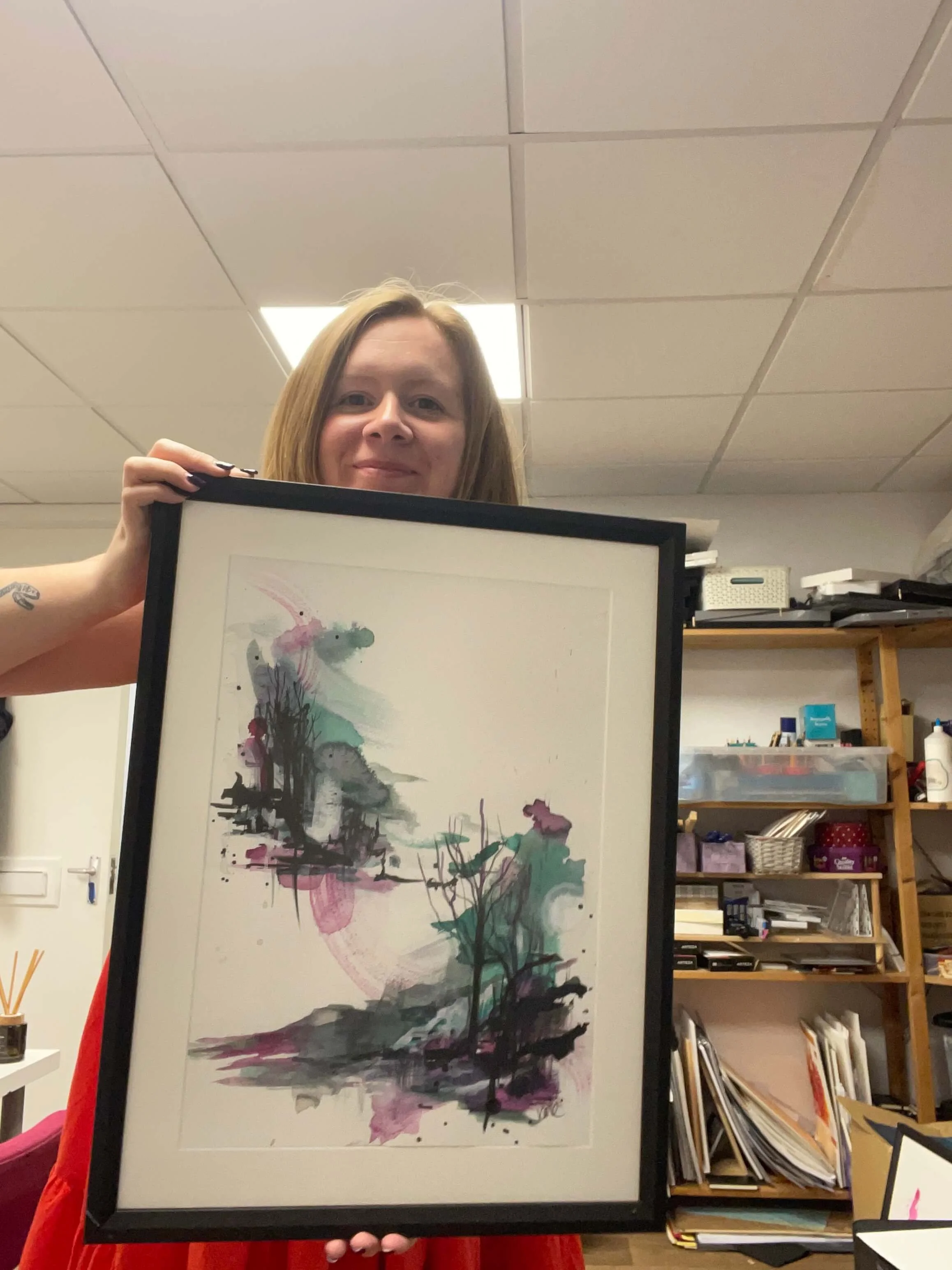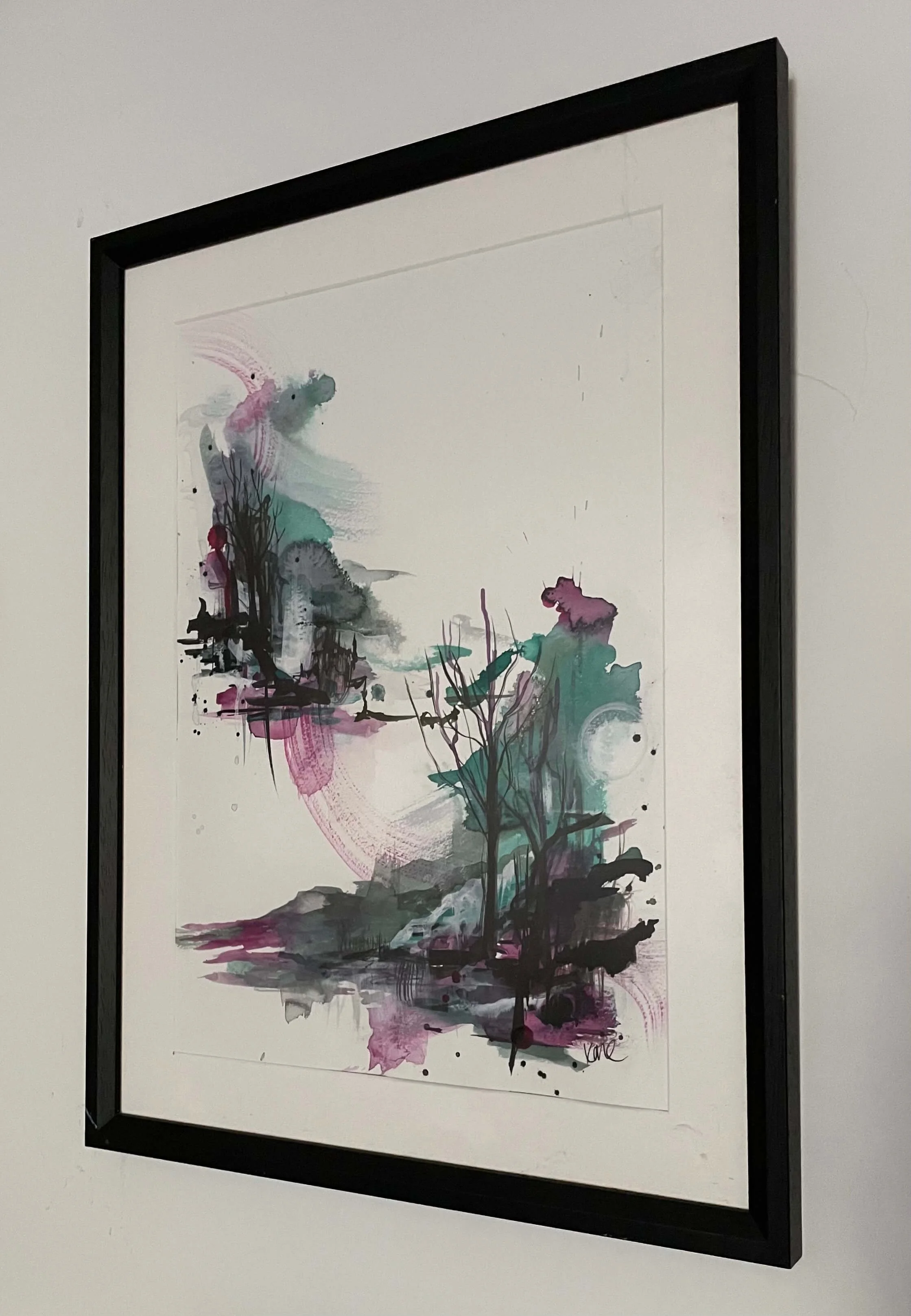 Experience the ethereal allure of this abstract landscape painting, depicting a breathtaking Scottish valley. Crafted with black, pink, and green inks, this artwork evokes a sense of tranquillity and wonder, making it a perfect addition to any home.